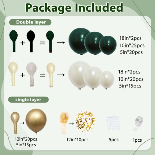 - 【Black Gold Balloon Arch】: The black and gold balloons garland kit includes: black balloons(5in-20pcs 10in-25pcs 18in-2pcs), chrome gold balloons(5in-15pcs 10in-20pcs), double stuffed pearl sand white balloons(5in-15pcs 10in-20pcs 18in-2pcs), 10pcs 12" gold confetti balloons, , 1 roll of decorative strip and 5pcs balloon sticker.