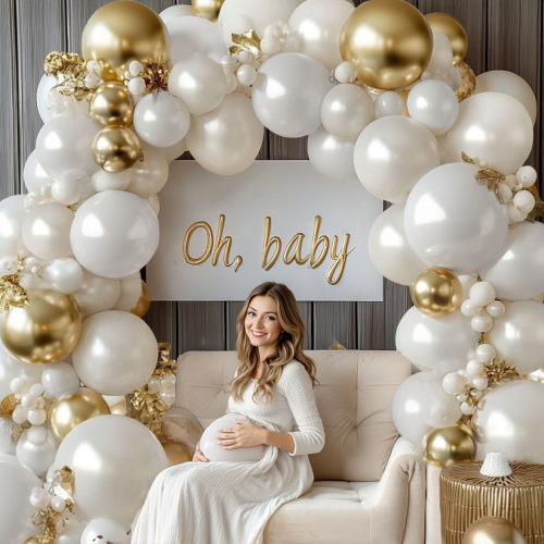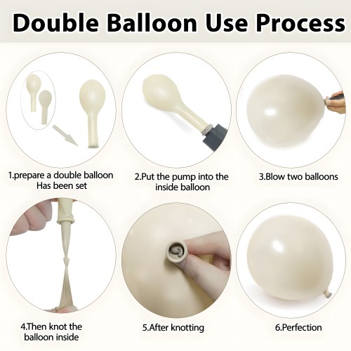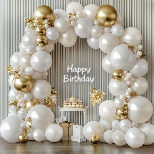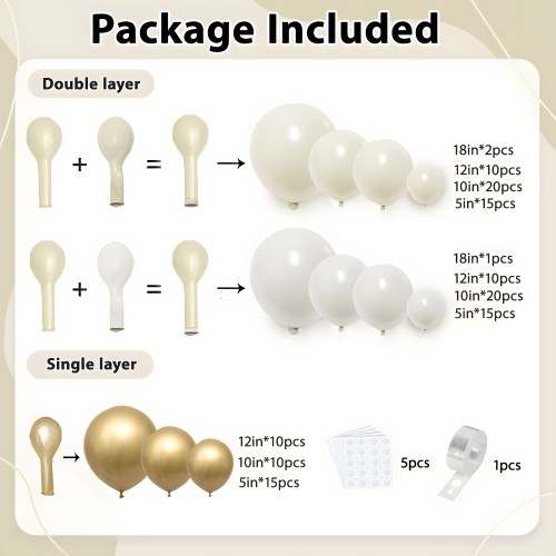 - 【Pearl White Balloon Arch】: These double stuffed pearl white balloons garland kit includes: double stuffed pearl white balloons 47pcs, double stuffed pearl sand white balloons 47pcs, chrome gold balloons 35pcs, , 1 roll of decorative strip and 5pcs balloon sticker.