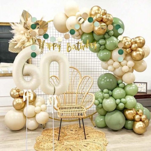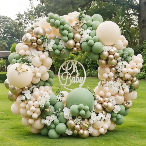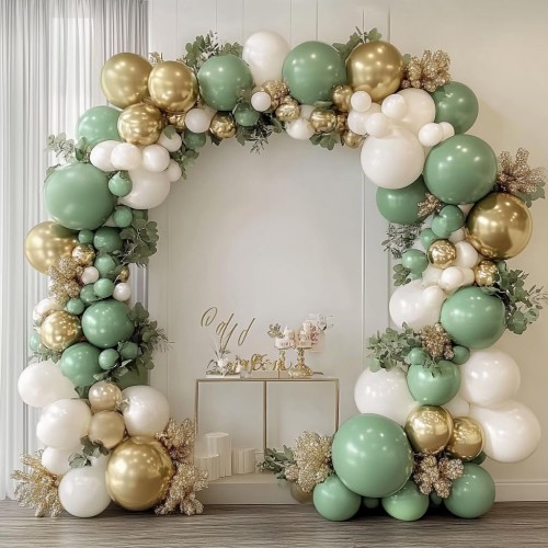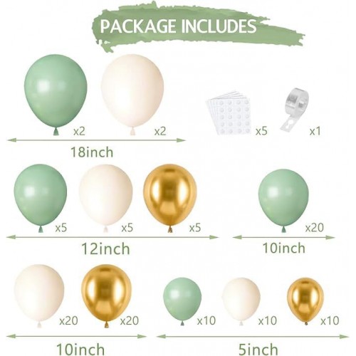 - 【Sage Green Balloons Garland】: This sage green balloons arch kit includes 52pcs 18/12/10/5 inch sage green balloons, 47pcs 18/12/10/5 inch sand white balloons, 45pcs 12/10/5 inch matellic gold balloons, 1 roll of decorative strip and 5pcs balloon sticker.