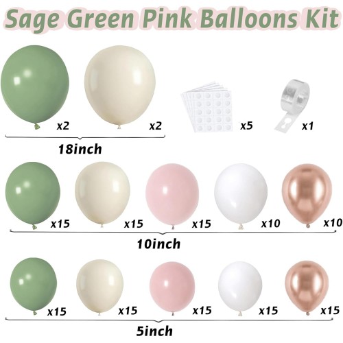 • 【Sage Green Pink Balloons】: This sage green pink balloons arch includes: 32pcs 18/10/5 inch sage green balloons, 32pcs 18/10/5 inch sand white balloons, 30pcs 10/5 inch baby pink balloons, 25pcs 10/5 inch metallic rose glod balloons, 25pcs 10/5 inch matte white balloons, 1 roll of decorative strip and 5pcs balloon sticker.