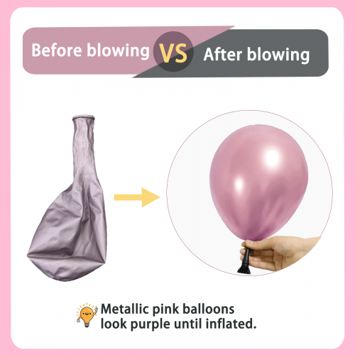 - 【Please note】: Please avoid exposing the pink metallic latex balloons kit to high temperature, sharp objects or excessive friction to prevent bursting. It is normal for balloon to oxidize after being inflated for a period of time, please don't worry.